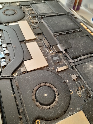 Besides risking failure through overheating, this MacBook is at serious risk of corrosion with an internal source of liquid! The debris inside this MacBook is a food source for insects and mollusks which expire when electrocuted and their moisture content results in corrosion which damages circuitry.