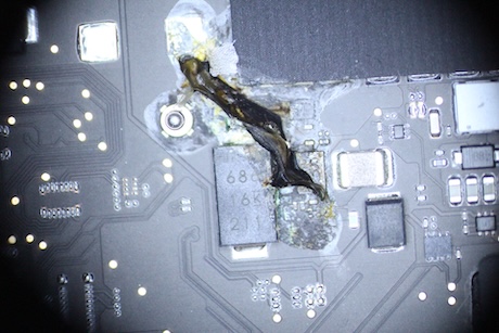 This slug probably met its end when it nestled on the power supply for the 45 volt screen backlight. Lights out for the slug and the screen! UK Mac Repair mended the MacBook and provided a small service for the slug.
