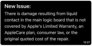 If Apple spots a tiny “tide mark”—even one caused by harmless rain drop that never reached the logic board—they often insist on replacing multiple parts at very high cost.